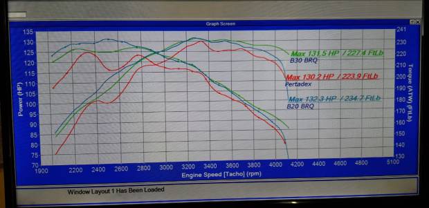 Agar hasilnya tetap adil, maka kami pun melakukan test dyno dengan mobil berbahan bakar diesel. Test pertama adalah antara B20 dengan BRQ / B30 dengan BRQ / Pertadex tanpa BRQ